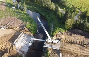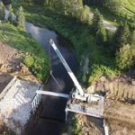 As this project included a new road alignment, traffic was accommodated on the existing road and the existing bridge was demolished last. Formula Alberta first constructed approximately 175m of road on either side of the new bridge location, including the installation of drainage culverts. Once the road was built up enough, bridge construction occurred which included the placement of pipe piles into pre-drilled holes and filling them with concrete. Also included was the construction of SPCS backwalls and steel abutment and pier caps as well as the installation of pier bracing, nose plates and Riprap. 14m girders were erected for each of the three spans then TL-2 Low Height Thrie Beam bridgerail was mounted. Once the new road alignment was completed and guardrail was installed, traffic was moved over. The old bridge structures compromising of a 30.5m long Pony Truss bridge and a 6.1, long timber bridge was then demolished, and a turn around area was created at the end of the old road.